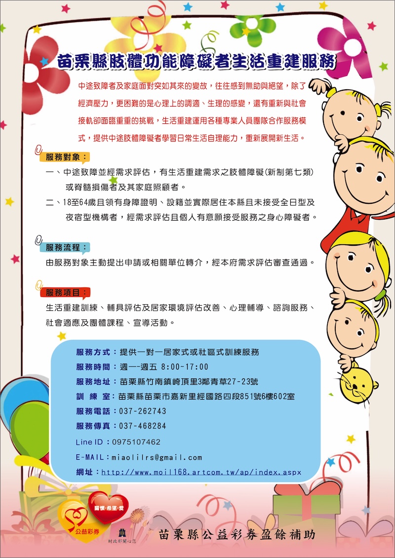 .版權所有:社團法人苗栗縣脊髓損傷者協會.瀏覽人數:235920 .本會會址:苗栗縣竹南鎮崎頂里3鄰青草27-23號 .聯絡電話:037-482838.傳真電話:037-468284 .IE7.0,Firefox.20以上版本.最佳螢幕解析度 1024x768 |隱私權宣告|資訊安全政策|